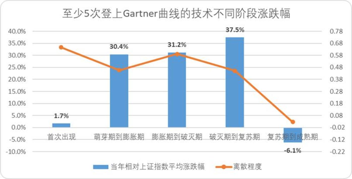 1)新兴技术在萌芽到膨胀期、膨胀到泡沫破裂期,破灭到复苏期转换的当年都有不俗的市场表现,相反概念首次出现和产业步入成熟时反倒估值比较稳定,收益明显下降。