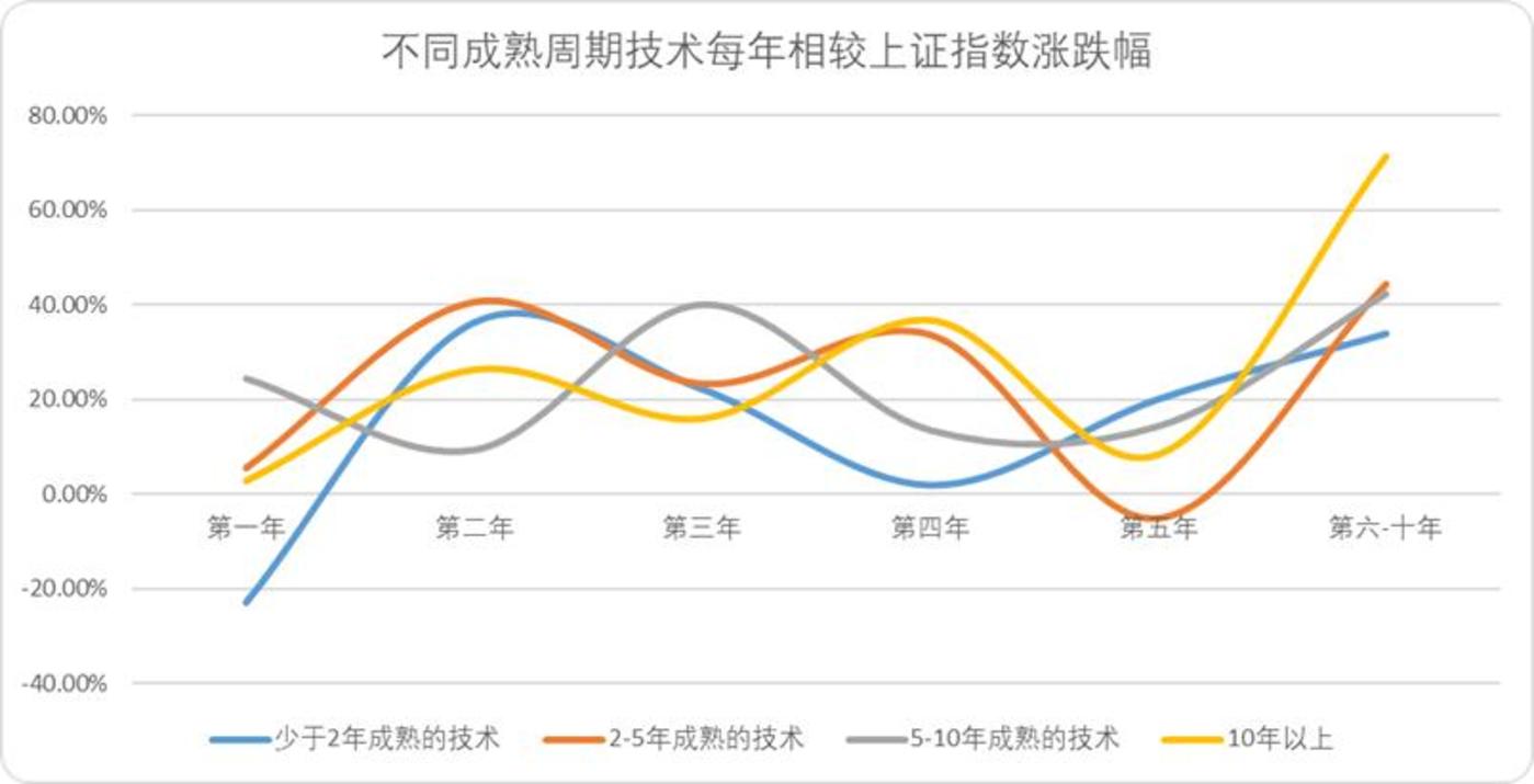 4)无论产业发展的实际情况如何,Gartner曲线对成熟周期的预测与市场资本相匹配,排除长周期的累计外,少于2年成熟的技术,往往第二年表现最强;2-5年成熟的技术,第2-4年的收益较高;5-10年成熟的技术、10年以上成熟的技术,都是第6-10年平均收益率最高。