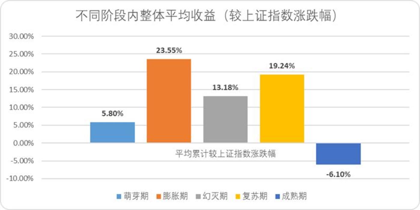 3)从阶段内的表现来看,除了成熟期投资收益与Gartner曲线相悖外,萌芽期、膨胀期、幻灭期和复苏期的收益表现与曲线大致相同。