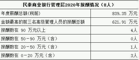 民泰商业银行管理层平均薪酬105万元。截至2020年末,民泰商业银行管理层共计10人,其中8人在本行领薪,年度薪酬总额839.35万元。金额最高的前三名高级管理人员的报酬总额621.91万元,占总额比74.09%,报酬在90万元以上共计4人,报酬在20-50万元之间1人,报酬在20万元以下3人。