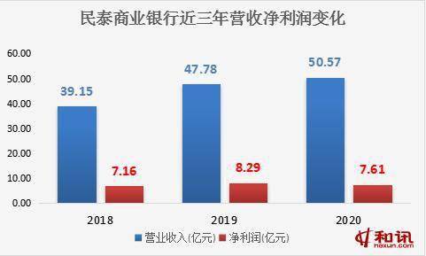 日前,民泰商业银行发布2020年年报,去年实现营业收入50.57亿元,同比上升5.84%;实现净利润7.61亿元,同比减少8.21%。