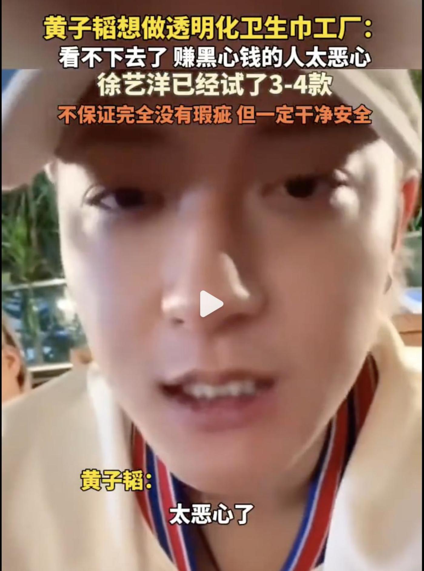 3月22日,#黄子韬宣布将做卫生巾#的话题登上热搜第一。这是源于他在直播中透露正在尝试生产卫生巾,并称自己真的看不下去了,那些赚卫生巾黑心钱的人真的太恶心了。