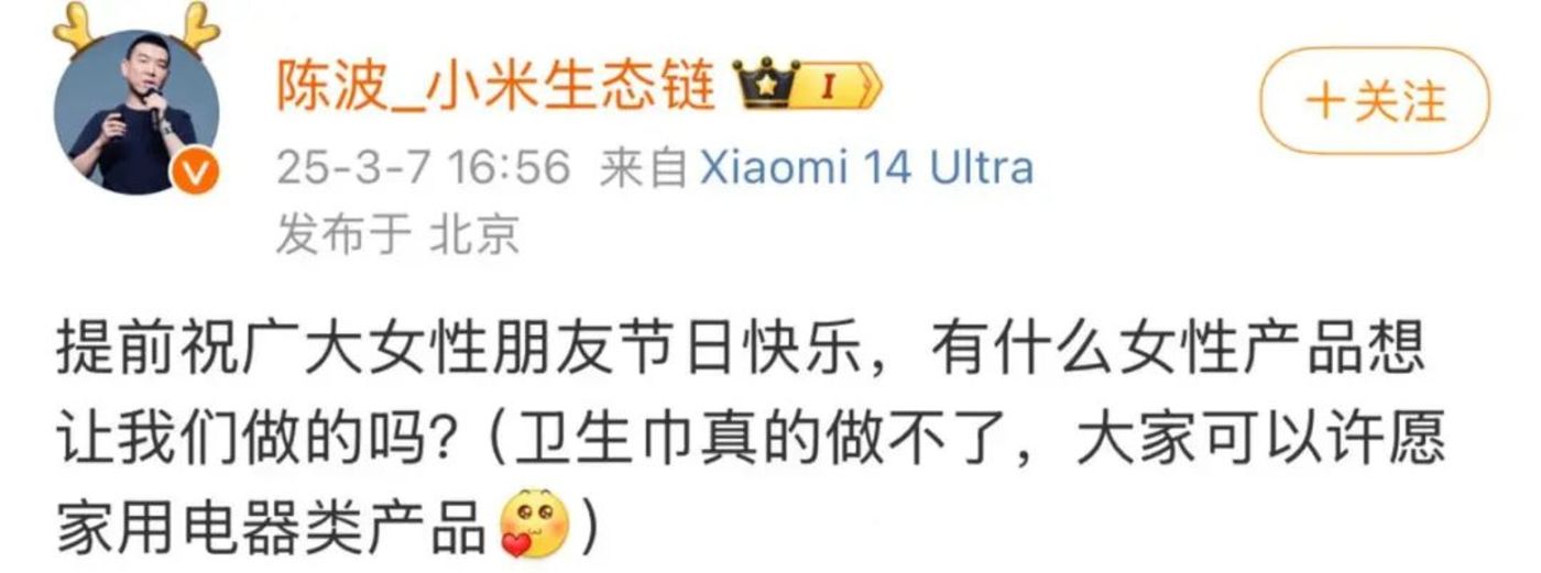 3月7日,小米生态链总经理陈波发文:“提前祝广大女性朋友节日快乐,有什么女性产品想让我们做的吗?卫生巾真的做不了,大家可以许愿家用电器类产品。”