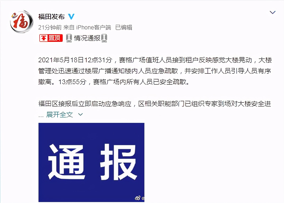 刚刚,据福田发布消息,2021年5月18日12点31分,赛格广场值班人员接到租户反映感觉大楼晃动,大楼管理处迅速通过楼层广播通知楼内人员应急疏散,并安排工作人员引导人员有序撤离。