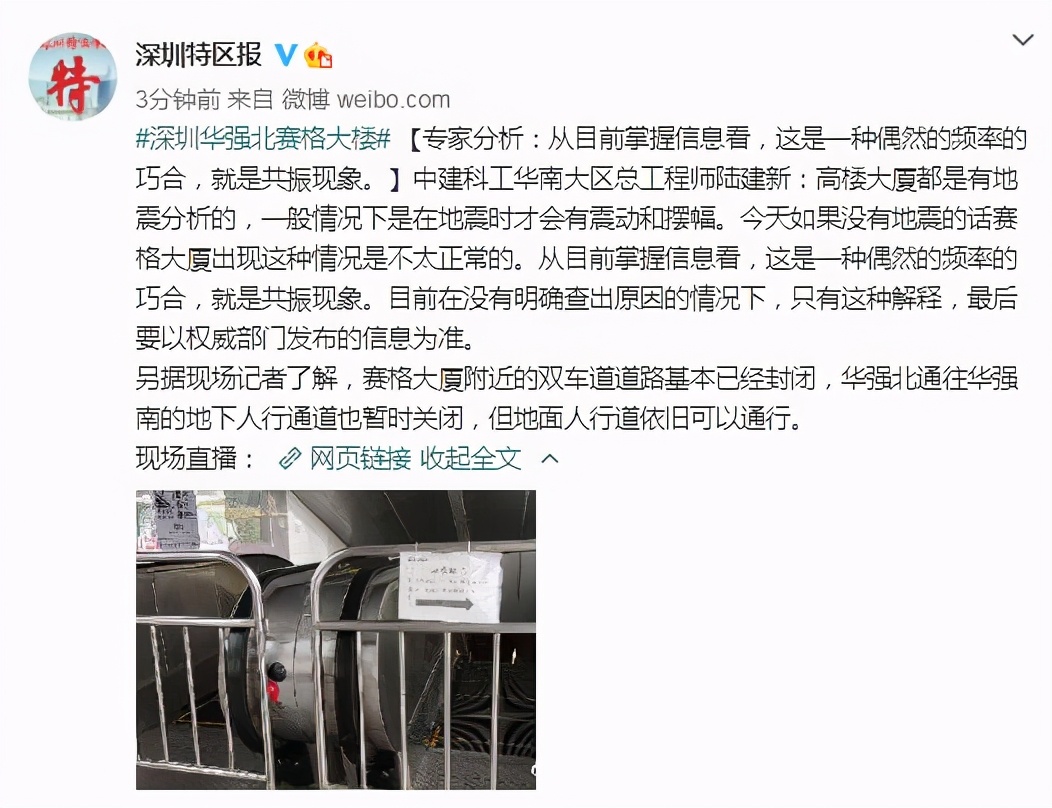 @深圳特区报 消息,中建科工华南大区总工程师陆建新:高楼大厦都是有地震分析的,一般情况下是在地震时才会有震动和摆幅。今天如果没有地震的话赛格大厦出现这种情况是不太正常的。从目前掌握信息看,这是一种偶然的频率的巧合,就是共振现象。