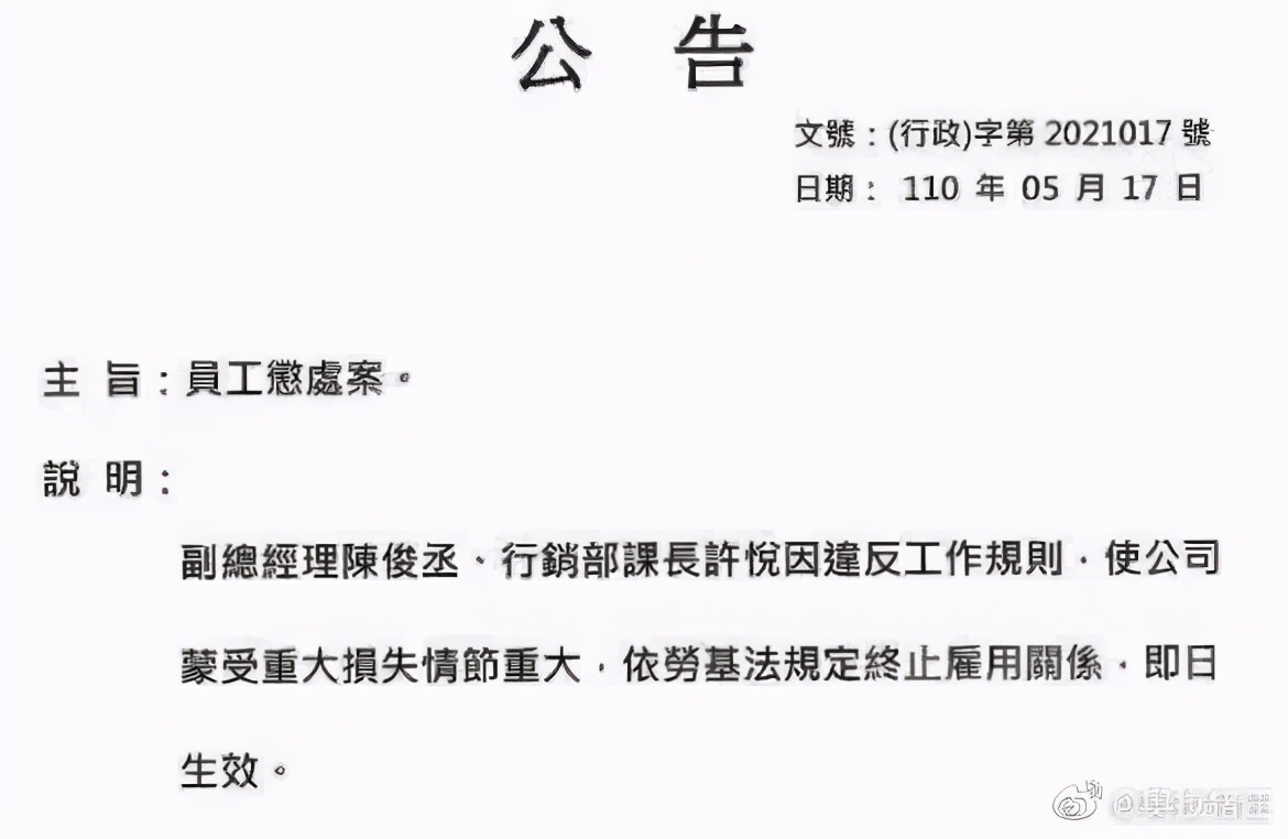 根据截图,一份文件主旨为“员工惩处案”,说明称,“副总经理陈俊丞、行销部课长许悦因违反工作规则,使公司蒙受重大损失情节重大,依劳务法规定终止雇佣关系,即日生效。”