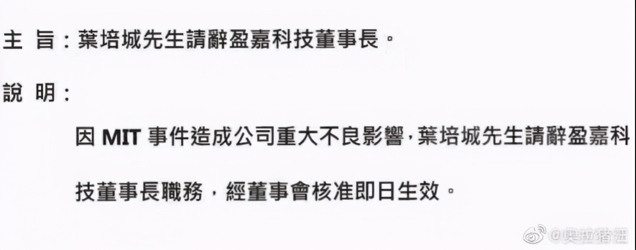 另一份文件主旨为“叶培城先生请辞盈嘉科技董事长”,说明称,“因MIT事件造成公司重大不良影响,叶培城先生请辞盈嘉科技董事长职务,经董事会核准即日生效”。维基百科显示,叶培城于1986年创办技嘉科技,目前是技嘉科技股份有限公司、宝嘉联合股份有限公司的创办人暨董事长。