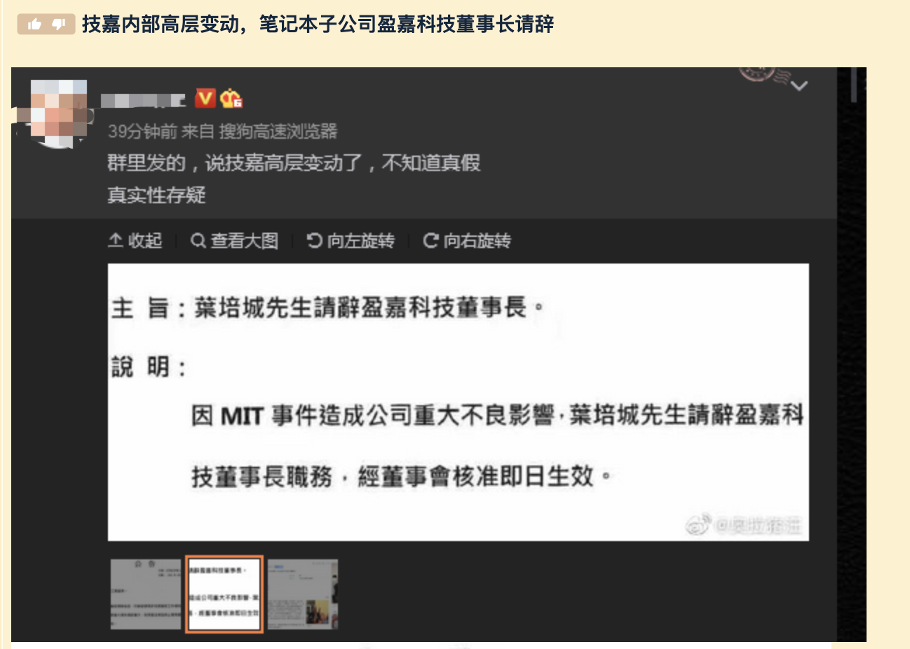 5月17日,“精英玩家俱乐部”论坛有网友发帖称,“技嘉内部高层变动,笔记本子公司盈嘉科技董事长请辞”。其发布了两份文件截图,并表示,“群里发的,说技嘉高层变动了,不知道真假,真实性存疑。”