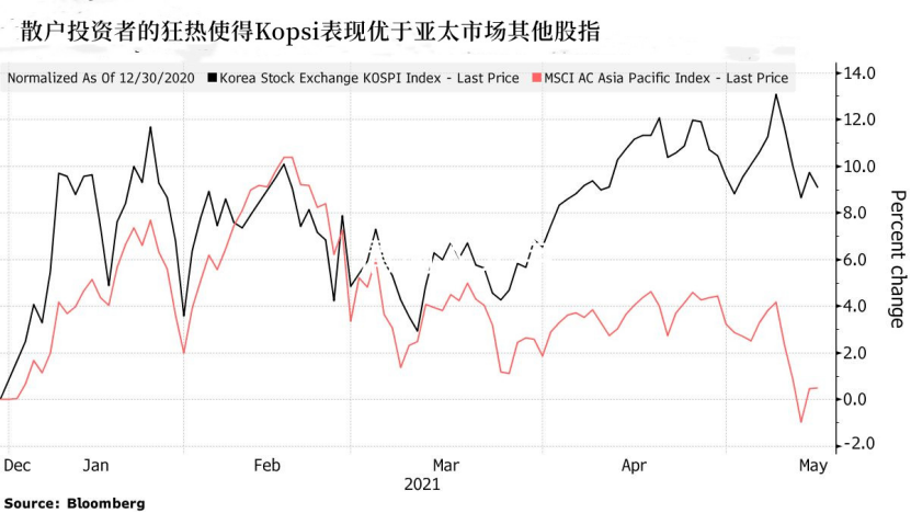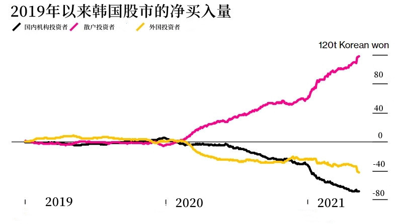 散户交易额已经占了韩国股市交易总额的四分之三。在宽松的货币政策刺激下,疫情期间赋闲在家的韩国散户们把Kopsi指数推高了30%,使其成为表现仅次于尼日利亚股票指数的股指。