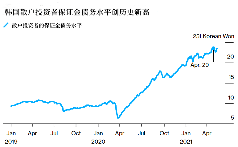 散户投资需求的上涨同样推高了保证金借款水平。根据韩国金融投资协会(Korea Financial Investment Association)的数据,4月29日,散户投资者的融资融券总额创下了23.5万亿韩元的纪录,并仍接近该水平。