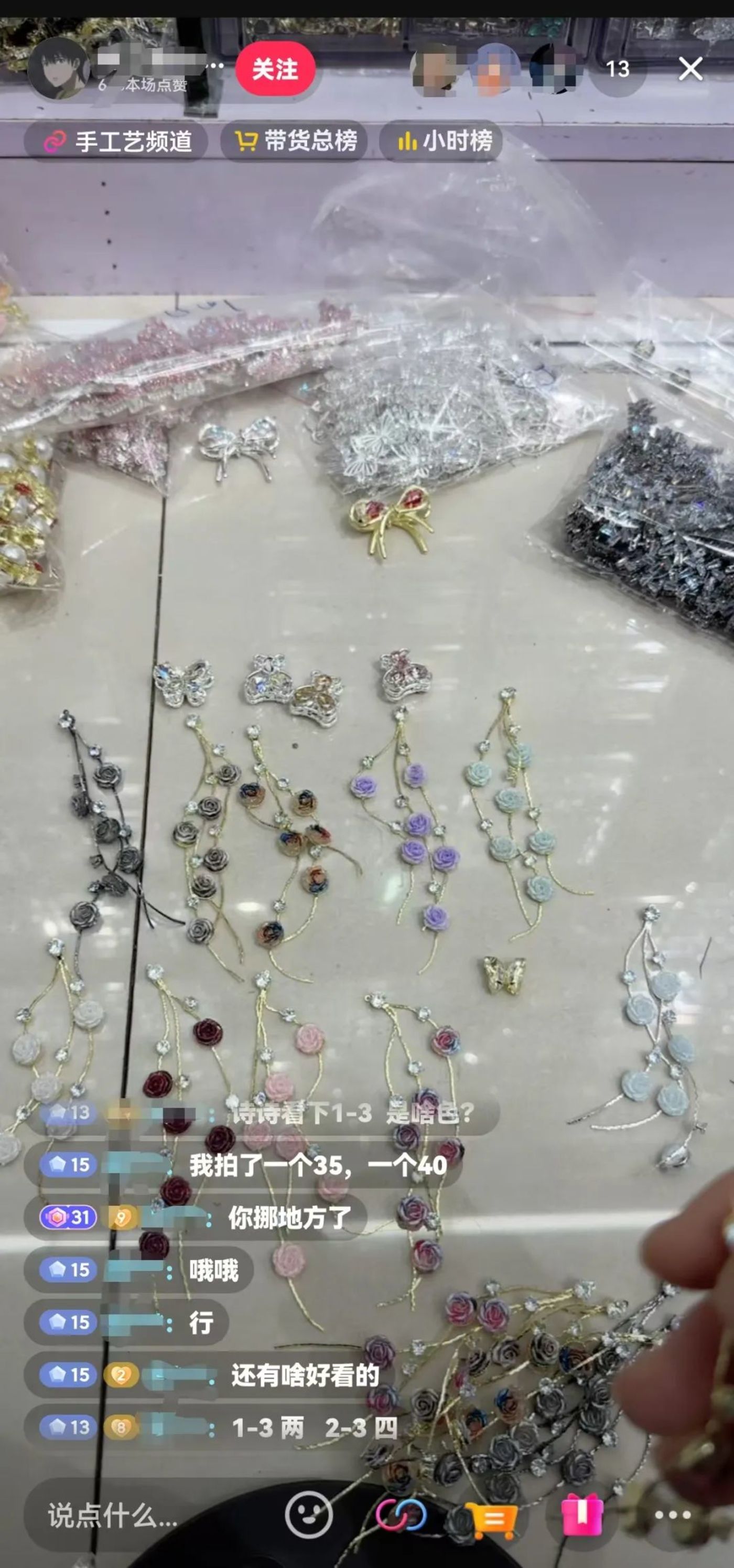 打开抖音,有时会划进一个系统推荐的直播间,镜头里,五彩斑斓的亮闪闪的diy手机链串珠在地上排列,有很多夸张的装饰,主播不出镜,用手一边展示商品一边向直播间的观众介绍,观众在公屏留言想看的款式,说什么挑什么,看好了再在直播间右下角的小黄车下单。