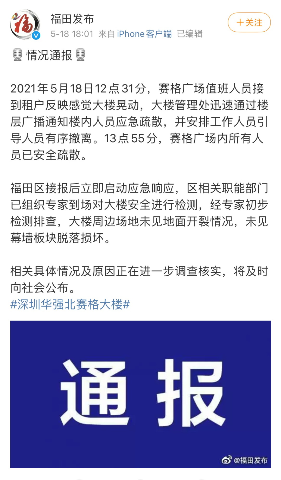 据深圳市应急管理局官方微博18日消息,5月18日13时50分许,深圳市应急管理局值班室接报:深圳市福田区华强北街道赛格大厦出现摇晃。经查看并分析全市各地震监测台站数据,今日深圳市未发生地震。赛格大厦摇晃原因相关部门正在核查。