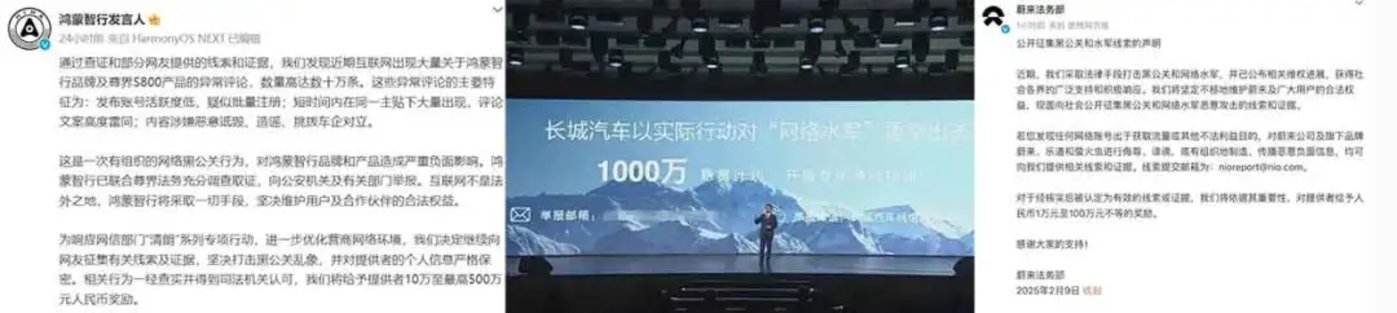 近日有市场传闻称,哪吒汽车研发团队将整体解散,哪吒汽车法务部紧急回应“不实”;蔚来法务部则频繁在社交平台发布“关于进一步打击黑公关和网络水军的声明”;尊界法务贴出多张“谣言”截图,称已“第一时间充分取证,并向公安机关报案”。
