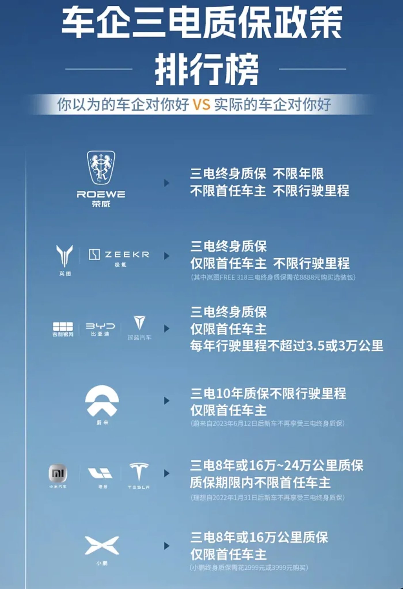 图/承诺三电终身质保的部分车企 来源/互联网 新能源观截图