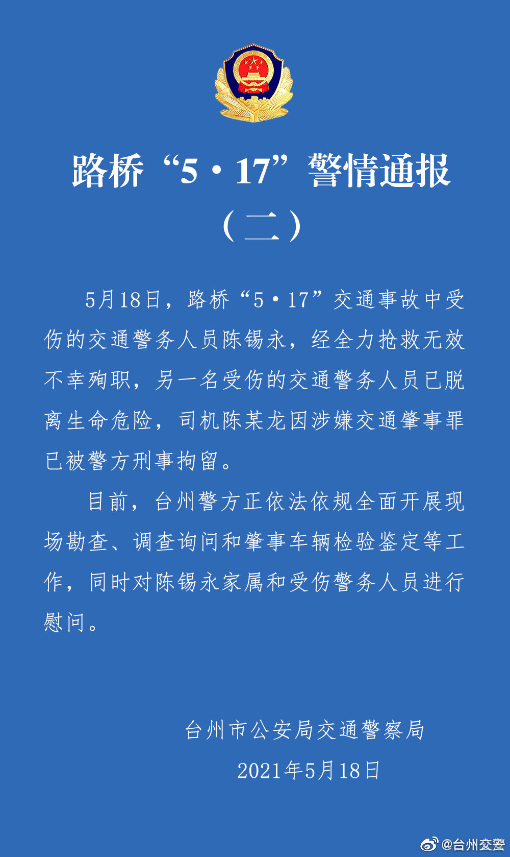 18日下午,台州市公安局交通警察局最新发布通报称,路桥“5·17”交通事故中受伤的交通警务人员陈锡永,经全力抢救无效不幸殉职,另一名受伤的交通警务人员已脱离生命危险,司机陈某龙因涉嫌交通肇事罪已被警方刑事拘留。目前,台州警方正依法依规全面开展现场勘查、调查询问和肇事车辆检验鉴定等工作,同时对陈锡永家属和受伤警务人员进行慰问。