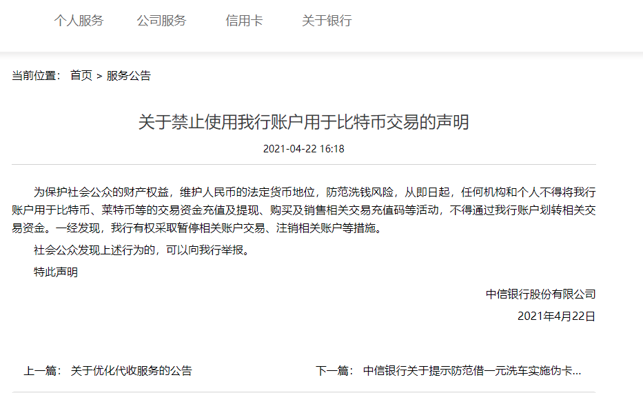 近日,中信银行官网发布公告称,从即日起,任何机构和个人不得将中信银行账户用于比特币、莱特币等的交易资金充值及提现、购买及销售相关交易充值码等活动,不得通过中信银行账户划转相关交易资金。一经发现,中信银行有权采取暂停相关账户交易、注销相关账户等措施。