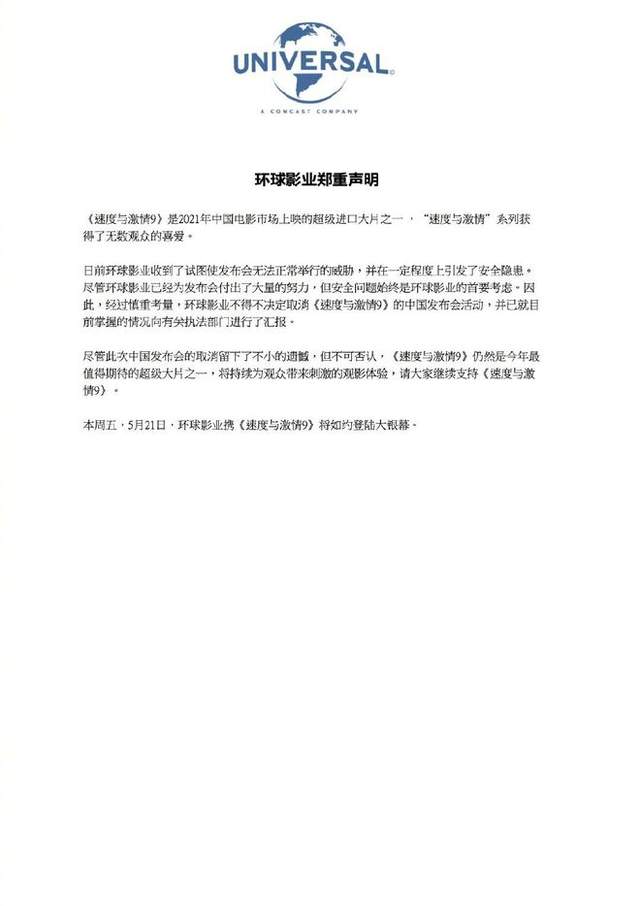 环球影业微博发布声明,称原定今天举行的《速度与激情9》中国发布会活动取消,原因是“环球影业收到了试图使发布会无法正常举行的威胁,并在一定程度上引发了安全隐患。”现已经向有关执法部门进行汇报。