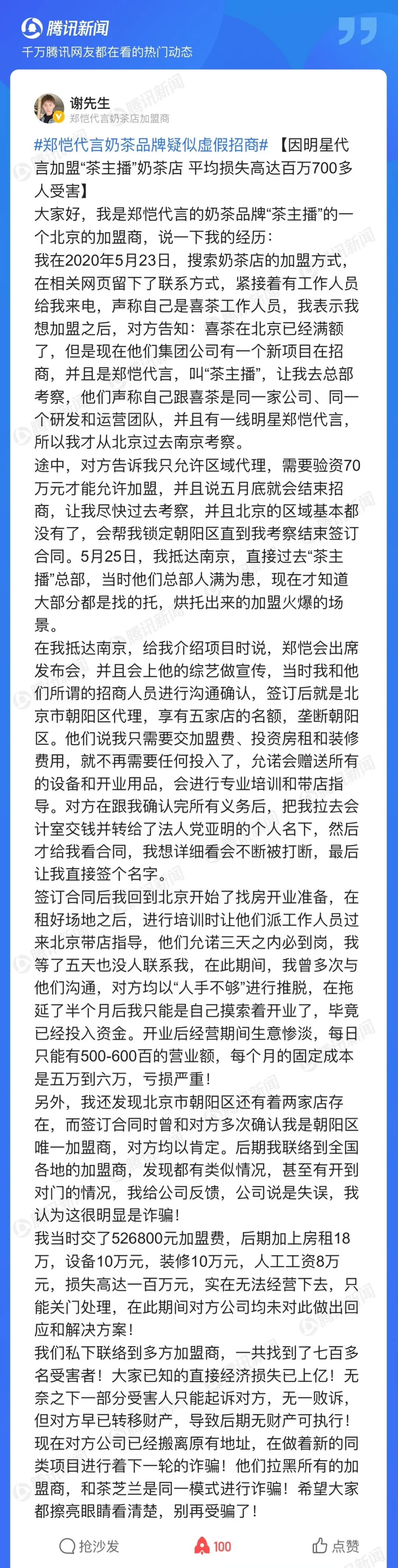 2020年5月25日,该网友抵达“茶主播”南京总部。考察过程中,对方表示郑恺会出席发布会而且会在相关综艺节目中为该品牌做宣传。