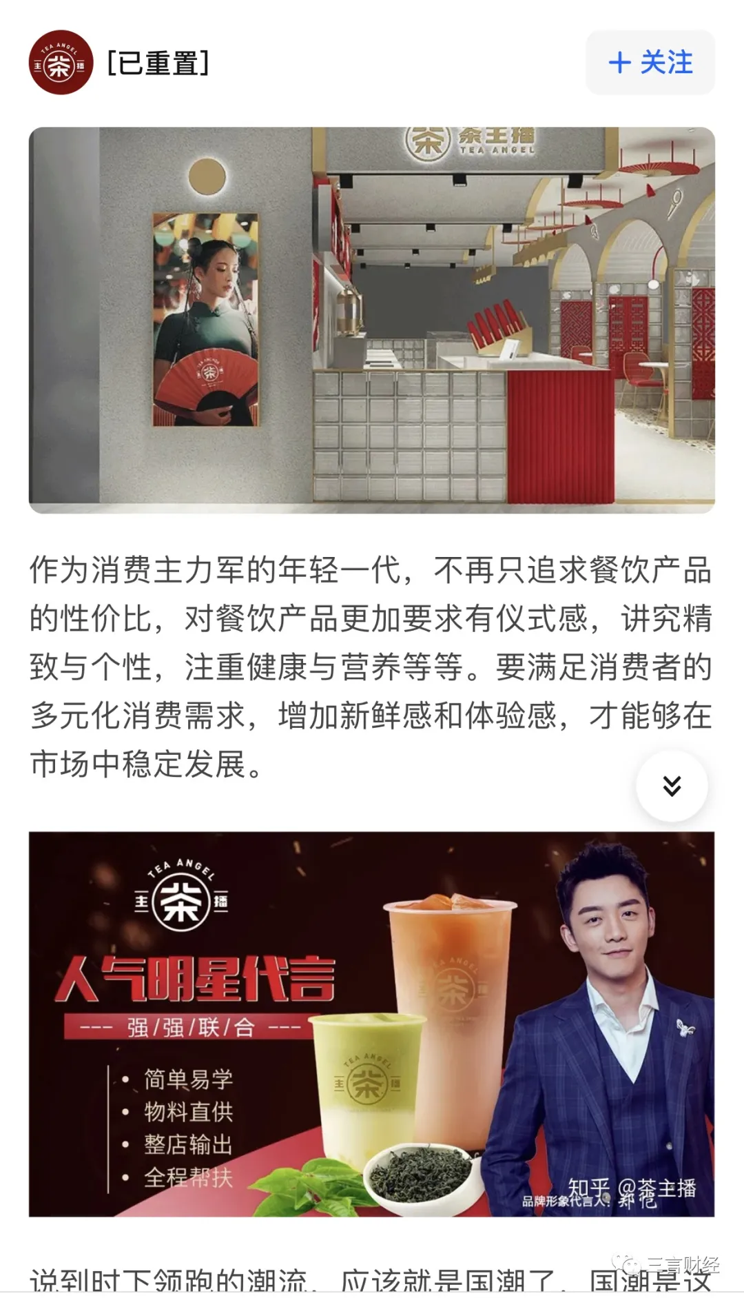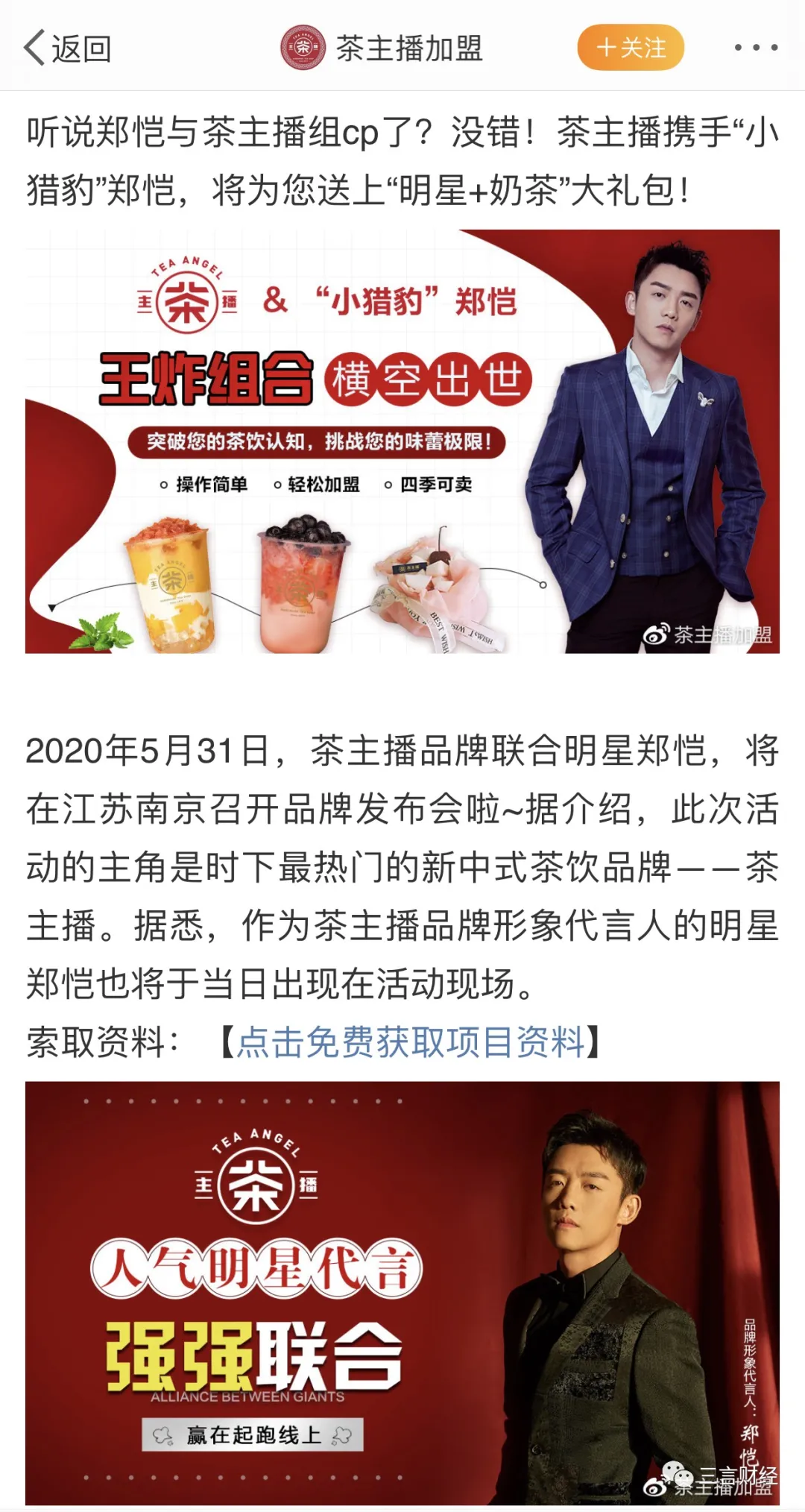 三言财经注意到,2020年起,“茶主播”在各种社交平台中均重点宣传艺人郑恺为其代言,并以“国潮”之类的宣传词汇邀请加盟商入驻。