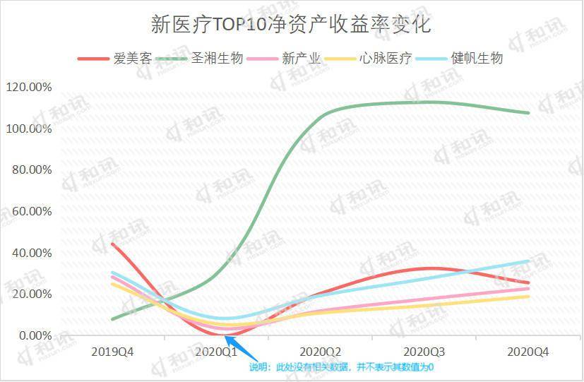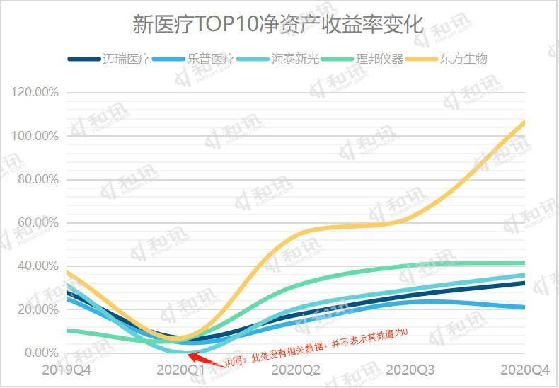 各季度环比之下,新医疗TOP10企业净资产收益率持续分化,延续强者恒强得局面,亦有后来居上的潜力股圣湘生物,净资产收益率一路攀升超越巨头摘得头冠,值为107.29%;东方生物位居第二,值为106.41%。
