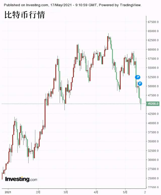 很快,彭博终端出现了这样一条新闻——“埃隆·马斯克暗示特斯特或抛售比特币持仓”,加密货币应声大跌,比特币重挫超10%,一度跌破43000美元关口。