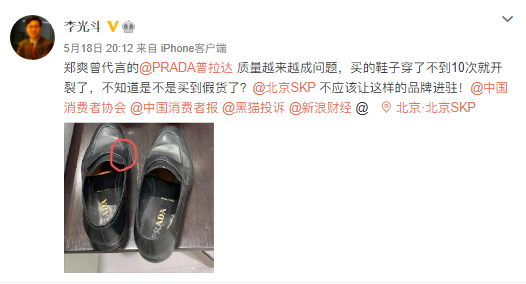 5月19日,中央电视台品牌顾问、品牌战略专家@李光斗 表示,郑爽代言的PRADA普拉达质量越来越成问题。“鞋子穿了不到10次就开裂,不知道是不是假货。”他还@了北京SKP表示不应让这样的品牌进驻。