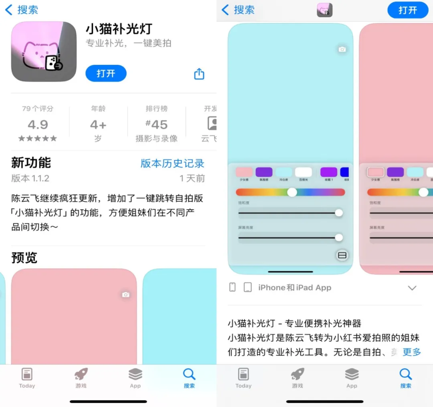 现在媒体和分发渠道都非常成熟,哪个产品火了,或者登上了App store下载榜单,很快就会被短视频博主以及科技商业作者关注到,接下来报道后就会出圈。最近一款名为“小猫补光灯”的App,就冲上了苹果iOS应用榜单Top20,据悉他从大场离职后,过去一年靠AI赚了近百万。