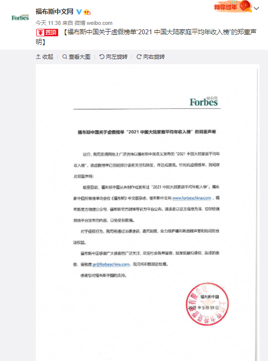 5月19日中午,经认证的@福布斯中文网 在官方微博表示,截至目前,福布斯中国从未制作或发布过“2021中国大陆家庭平均年收入榜”。