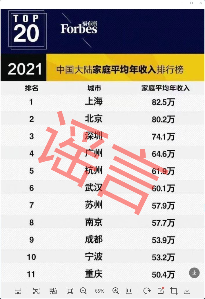 近日,有一张名为“福布斯2021中国大陆家庭平均年收入榜”的图片在网上流传。