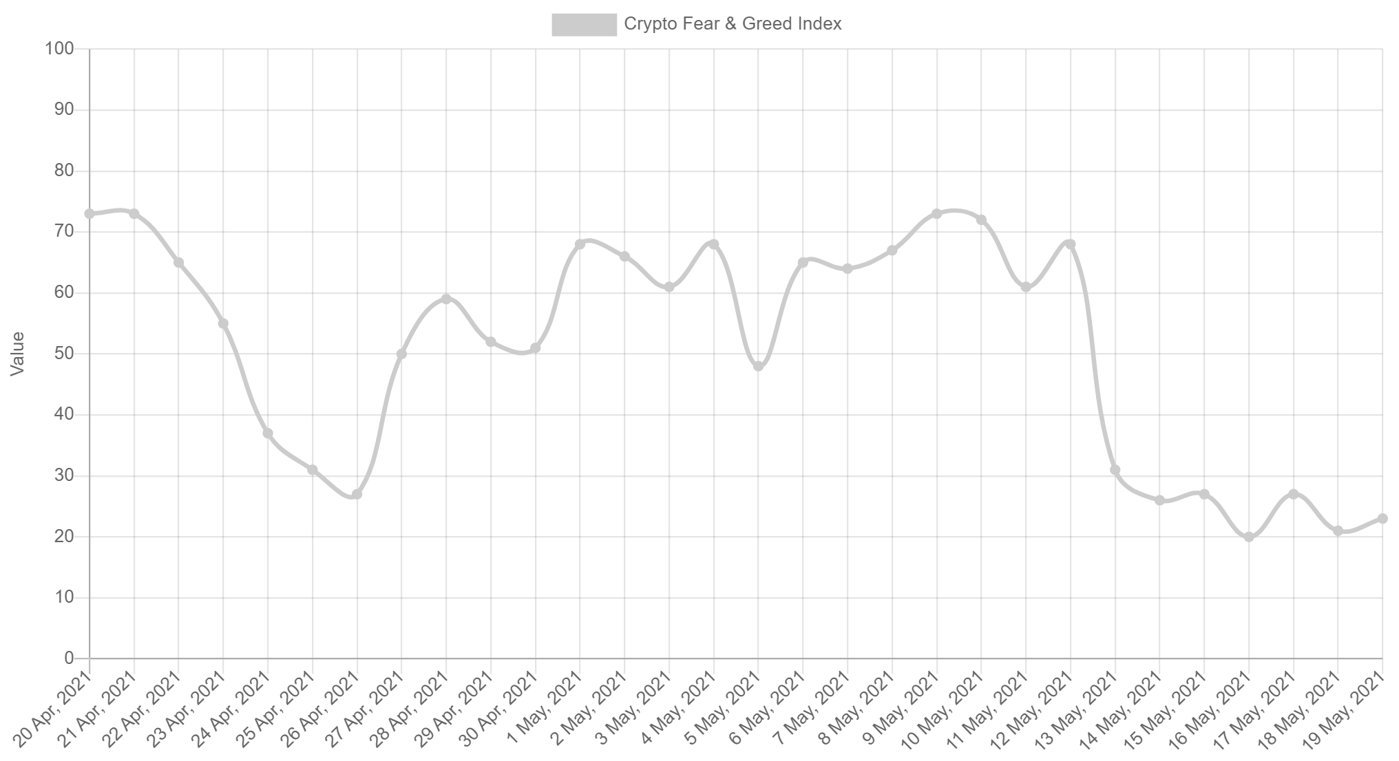 跌跌不休的走势也反映出过去一周加密货币市场面对的一系列坏消息,从5月12日特斯拉宣布因“不环保”暂停接受比特币付款,到昨日中国三大金融和支付协会警告虚拟货币炒作风险,投机者情绪不断崩坏也造成加密货币价格节节下挫。