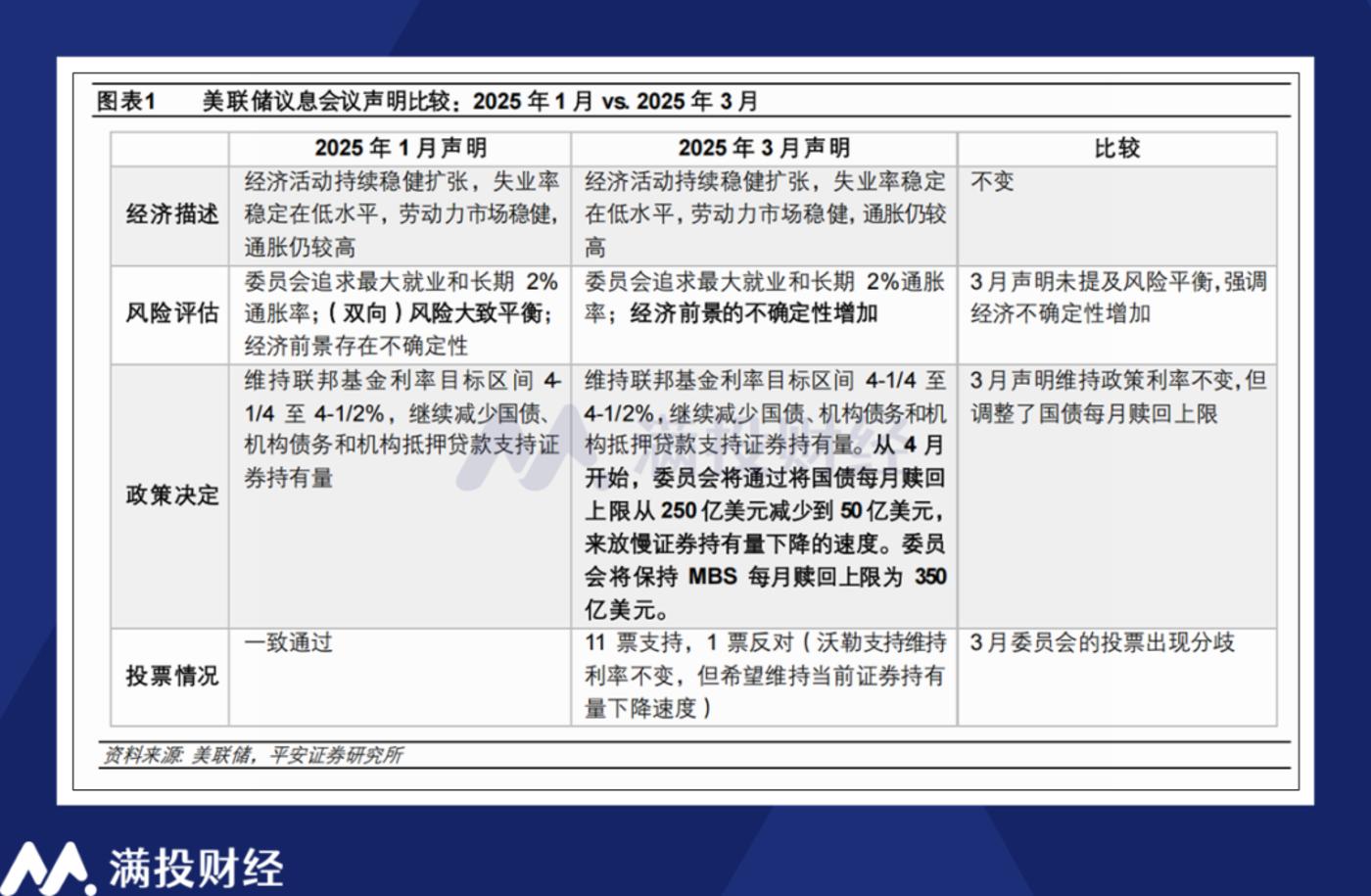 需要指出的是,特朗普的关税政策对经济增速与通胀均有冲击,而当前的美联储或许在通胀部分的预估会有所不足。由于短期通胀预期也会影响居民和企业行为,引发通胀的螺旋上升。按鲍威尔在本次新闻发布会所表述的“只看长期通胀预测”可能会产生错误的判断。若通胀超预期上行,那么美联储在年中将要面对控通胀和稳经济的艰难选择,届时或使市场的不确定性进一步提升。