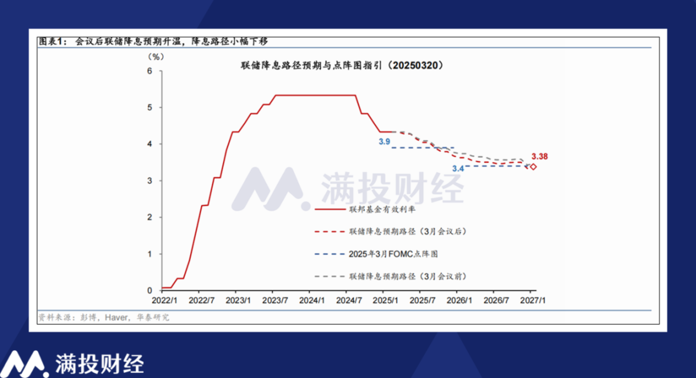 从鲍威尔会议中的言论以及会议后放出的点阵图来看,美联储在试图向市场传达稳定的信号,即尽管特朗普的关税政策会令美国经济的不稳定性加重,但美联储既定的降息进程仍会如常推进,只是节奏上会有所调整。这也是鲍威尔在特朗普上台前后坚持的表态,即美联储的方针不会因为总统的变更而动摇。