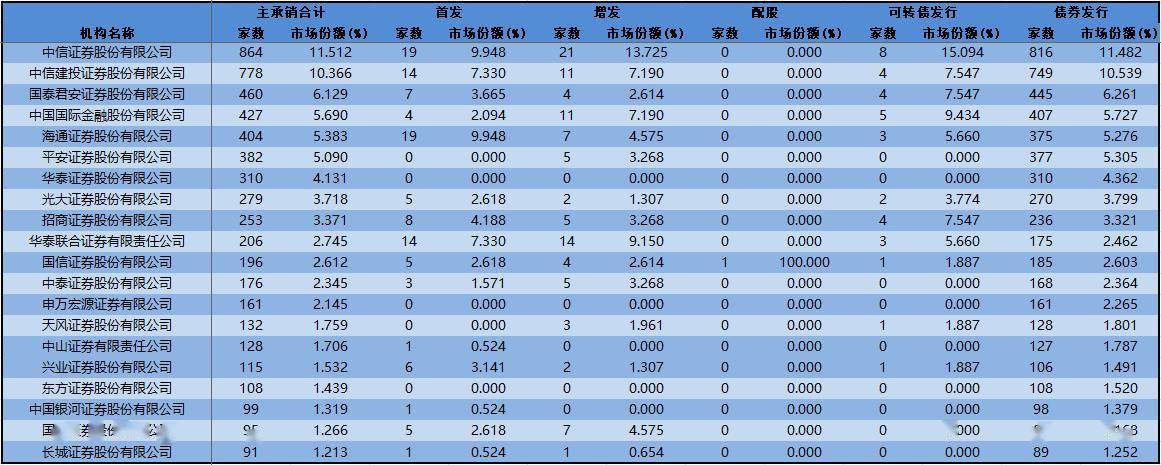 通常来说,投行业务包括IPO、增发、配股、可转债发行和债券发行五部分。从承销家数来看,同花顺iFind数据显示,截止5月18日(下同),今年中信证券、中信建投证券、国泰君安证券、中金公司、海通证券作为主承销商承销家数超过400家,其中,中信证券承销家数为864家,中信建投证券承销家数为778家。