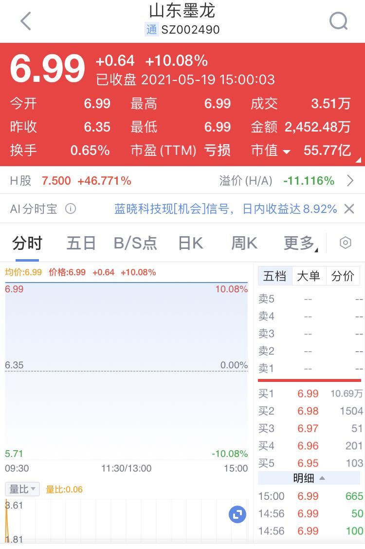 9天5板!今天(5月19日),截至收盘,山东墨龙现价6.99元,涨幅10.08%。而该股港股股价更是堪称炸裂,5月18日,山东墨龙港股股价飙涨46.77%,报7.5港元。