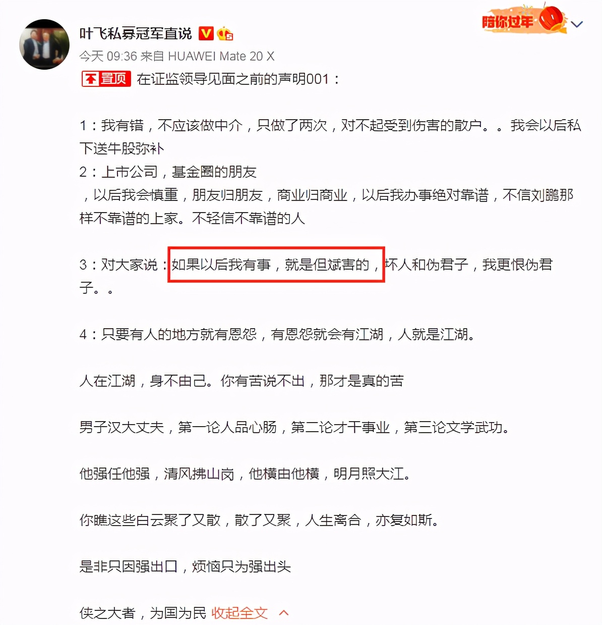 今天,叶飞“爆料门”大戏没有什么特别吸引眼球的进展,无非就是叶飞的“嘴仗”公开怼上了但斌,还配上了一堆电视剧《笑傲江湖》中岳不群的剧照,似有所指。