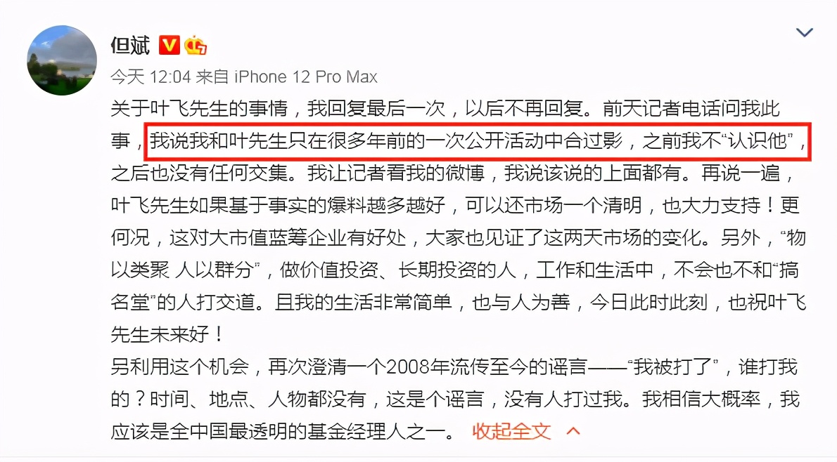 面对这一“挑战”,但斌只有在叶飞发文2个半小时后在微博上回复称与叶飞“没有任何交集”,文中满满地是无奈的味道。