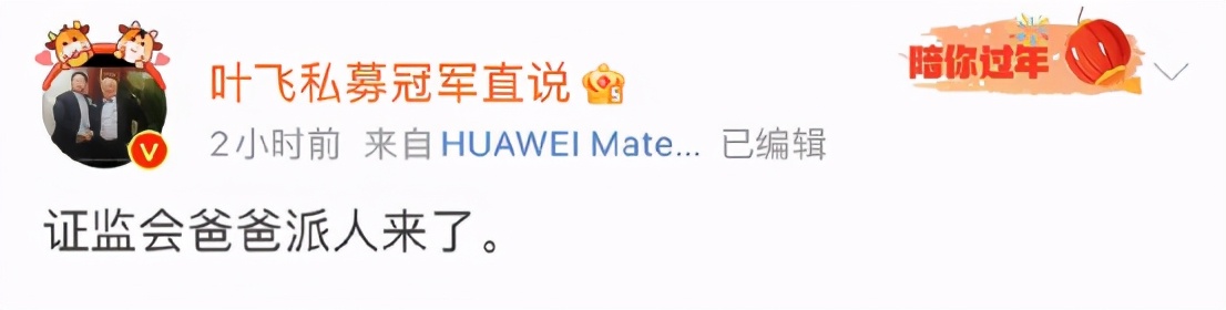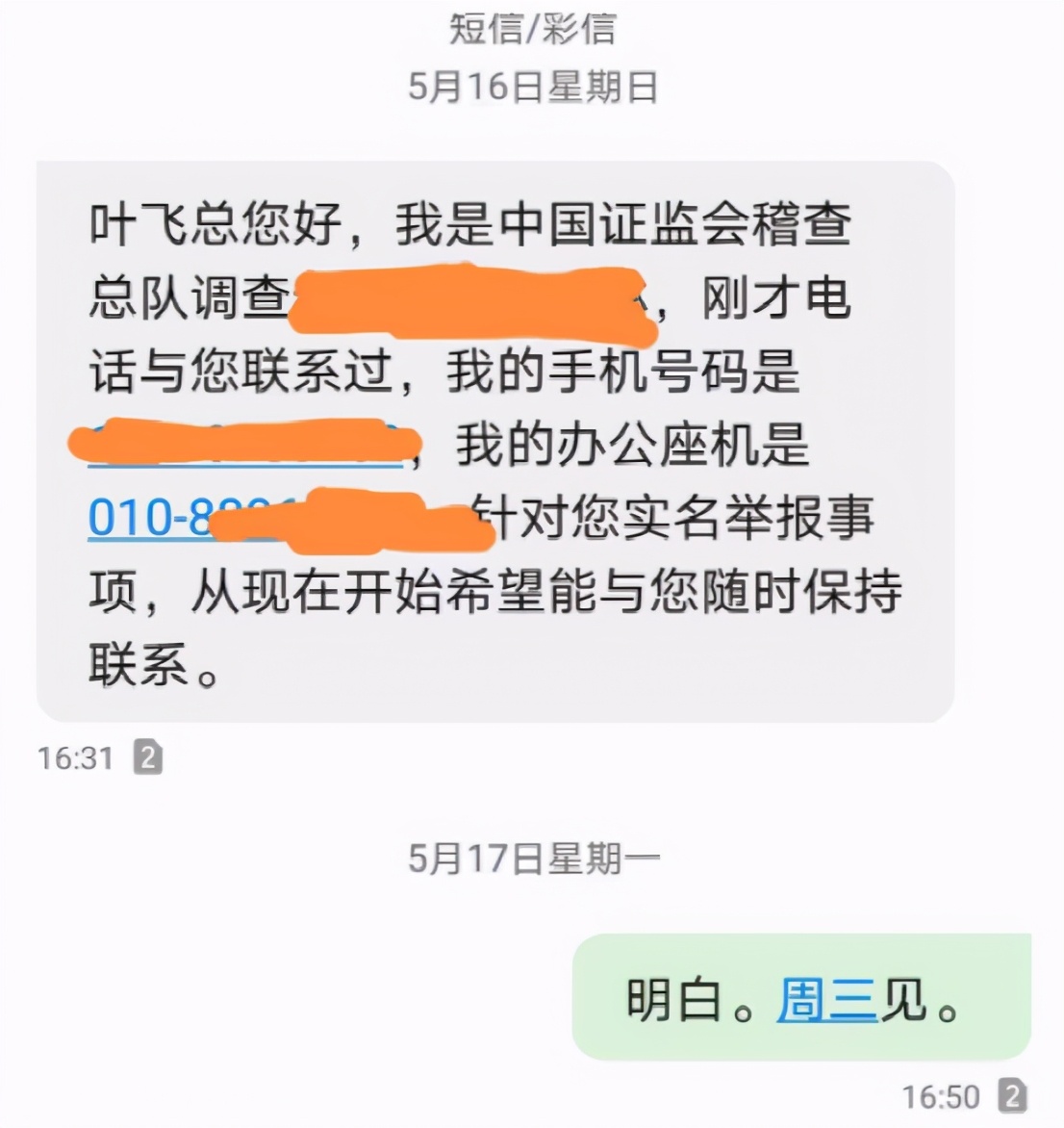 5月19日上午,叶飞在其认证微博发文称,证监会稽查总队近日与其约定在今日(周三)见面,针对其实名举报事项。