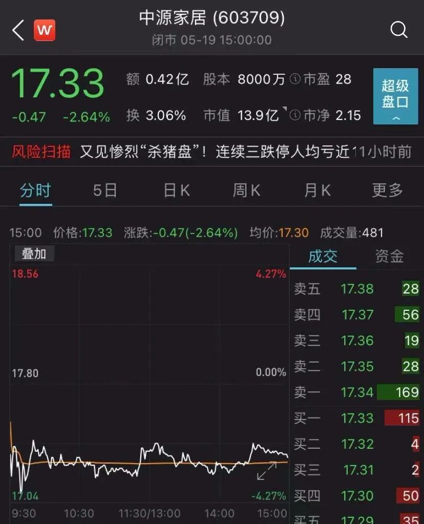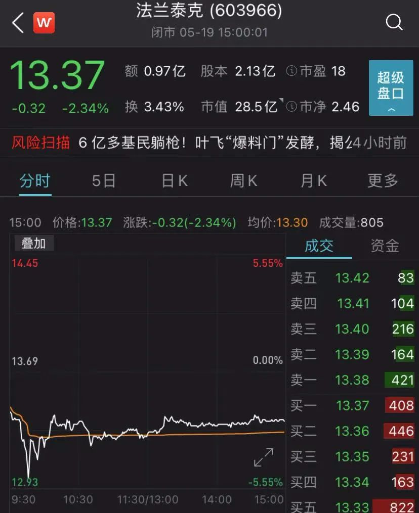 5月19日,部分叶飞概念股初现止跌企稳迹象,但仍有涉事公司股价继续大跌。截止记者发稿,中源家居下跌2.87%,法兰泰克下跌3.14%。
