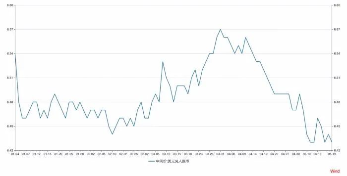 人民币对美元中间价维持在6.4~6.5区间已有一月之久。据中国外汇交易中心,5月19日人民币对美元中间价报6.4255,较前一交易日调升102个基点,中间价升至5月12日以来最高,逼近2018年6月19日报价6.4235的高点。