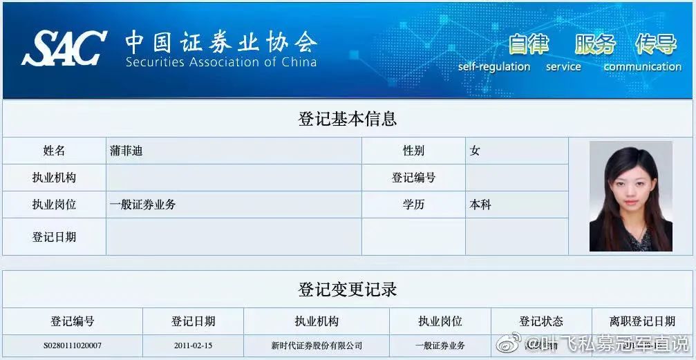 蒲菲迪为莘天使基金管理(深圳)有限公司法人代表、总经理,已任此职4年。此前,她于2009年起在新时代证券公司工作,自称2015年离职,中国证券业协会网站显示其2013年离职。其职务为市场拓展部业务经理。一般来说,这是一个拉客户的职务。在新时代证券公司之前,她供职于四川银时股权投资基金管理有限公司总经办总经理兼项目经理。四川银时成立于2014年2月,那时蒲菲迪27岁。