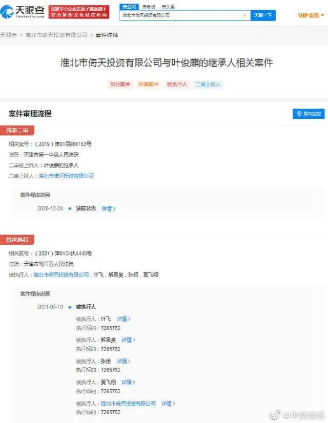 天眼查App显示,近日,叶飞及其关联公司淮北市倚天投资有限公司等已成为被执行人,执行标的7265782元,案号(2021)津0104执4440号,执行法院为天津市南开区人民法院。截至目前,叶飞及其公司被执行数额超836万元 。同时,该公司多次被列为失信被执行人(老赖),涉及多则终本案件及限制消费令。淮北市倚天投资有限公司成立于2010年4月,注册资本1000万人民币,法定代表人为张文珂,经营范围含私募证券投资、股权投资、创业投资。股东信息显示,叶飞持股99%为最大股东、最终受益人及疑似实际控制人。