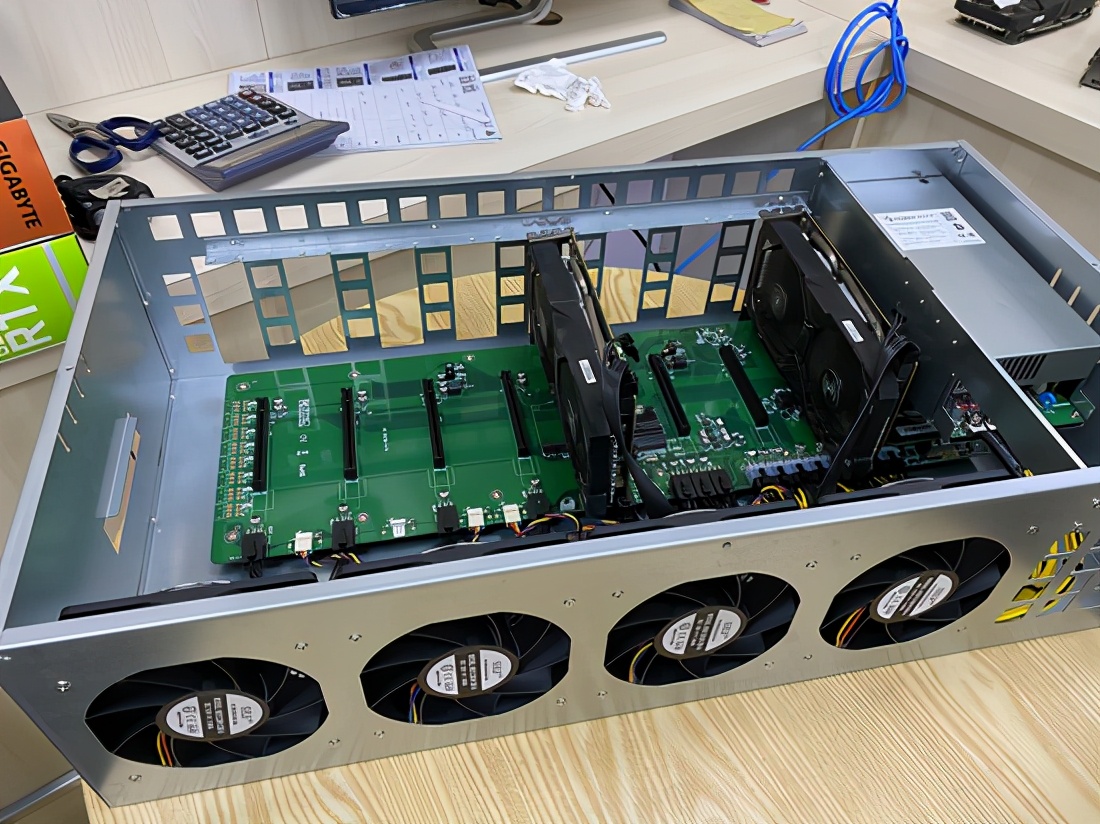 (显卡和主机组装成的以太坊矿机,其中右侧显卡在测试时因温度过高冒烟着火)
