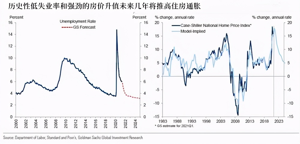 一旦疫情特殊因素过去,劳动力市场迅速改善和房地产市场的繁荣应该会推动住房价格的大幅上涨。下张图表显示,高盛预计失业率最终将跌至低点,低于上个周期达到的50年低点,并预计房地产市场供需持续失衡将在今明两年带来两位数的房价上涨幅度。