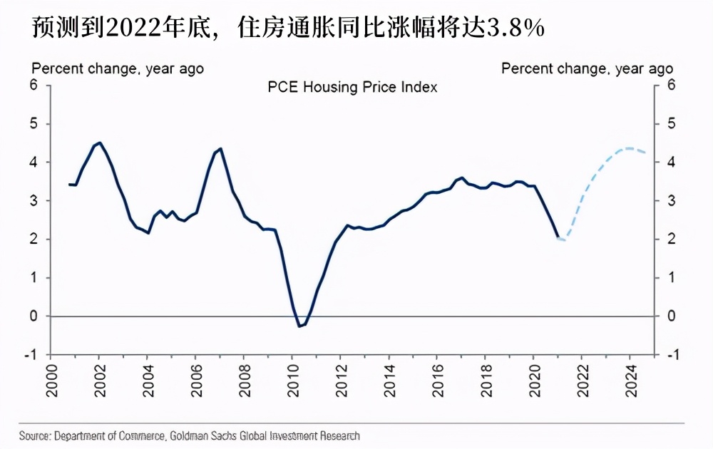 根据全国个人消费支出数据(PCE),高盛预测,到2022年底,住房通货膨胀率可能同比飙升至3.8%,推动核心PCE指数上涨;到2023年,住房通货膨胀率将升至4%以上,比上一个经济周期的任何时候都要高。到那时应该没有人再说通胀是暂时现象了。
