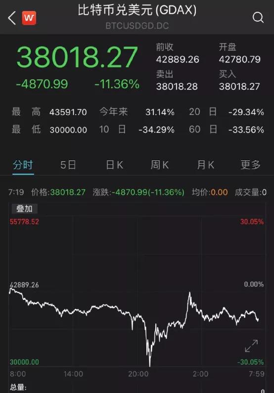 但在暴力反弹后,今晨,比特币价格有所回落,截至发稿,比特币价格跌破40000美元,在38000美元左右徘徊。
