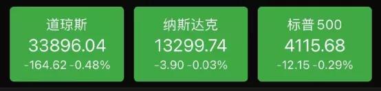截至收盘,道指跌0.48%,报33896.04点;纳指跌0.03%,报13299.74点;标普500指数跌0.29%,报4115.68点。