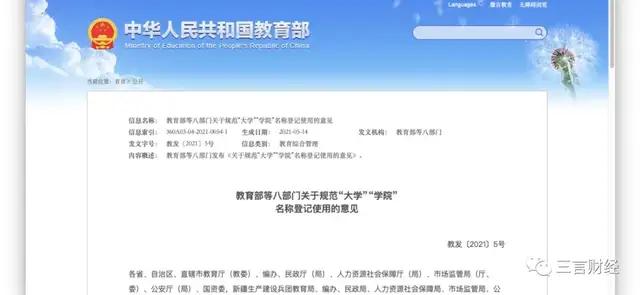 5月18日,教育部官网发布《教育部等八部门关于规范“大学”“学院”名称登记使用的意见》。