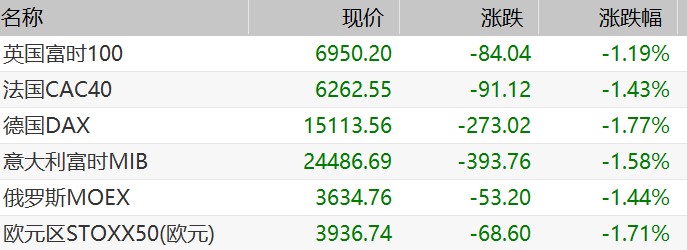 全球股市方面,欧美股市也集体下挫。截至发稿时,欧洲主要股指均大幅收跌,其中,德国DAX指数跌1.77%,法国CAC40指数跌1.43%,英国富时100指数跌1.19%。