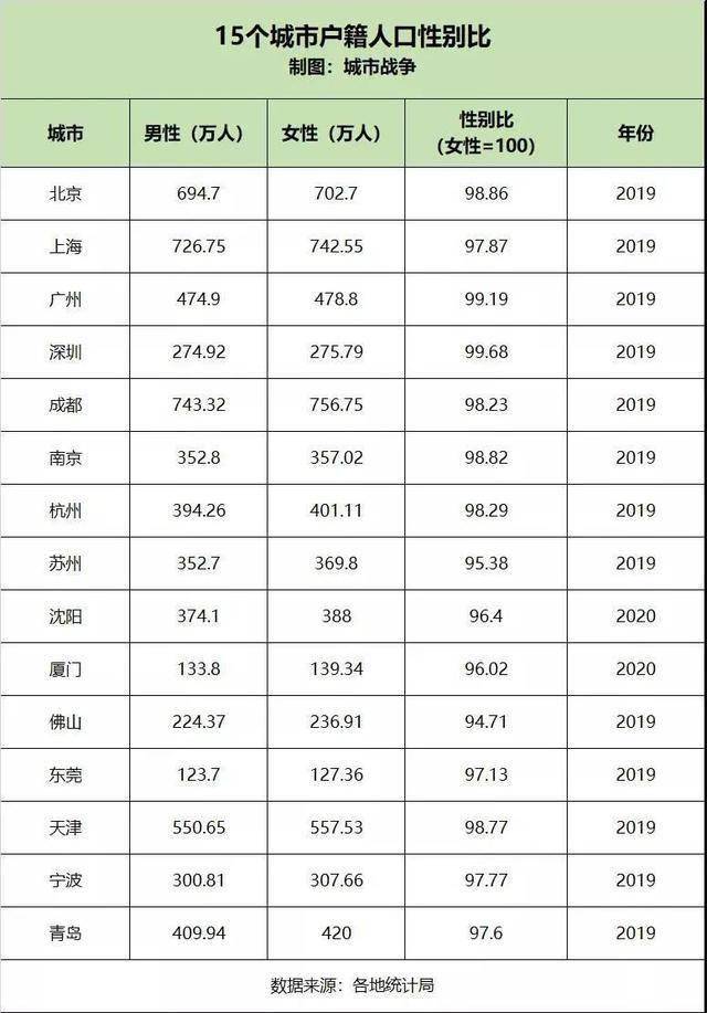 近日,各大城市统计年鉴陆续发布。在户籍人口方面, 包括 北上广深在内的15个特大城市,不约而同地呈现出一个共性特征:女多男少。