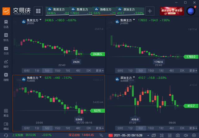 在前一日夜盘,国内期市夜盘也是大面积飘绿,黑色系普跌,截至收盘,焦煤跌7.98%,铁矿石跌7.92%,动力煤跌7.81%,热轧卷板跌7.21%,螺纹钢跌7.07%。
